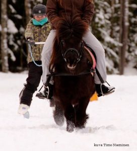 Ratsastusta ja kärryajelua, lumitilanteen salliessa ponipulkkailun ja/tai hiihtoratsastuksen kera. Lisäksi lounas ja ponien hoitoa. Päiväleirinä klo 10:00-15:00. h.50e/hlö.